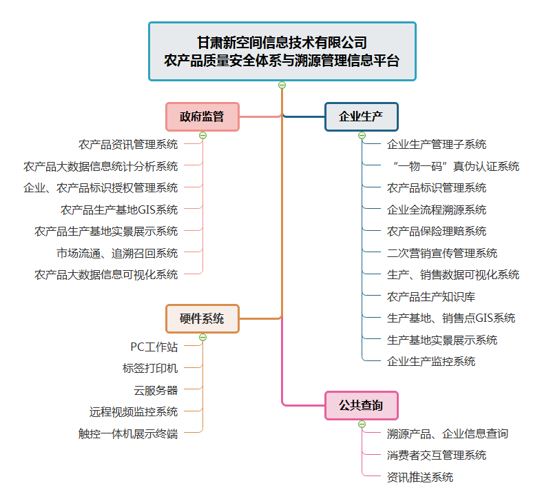為了更好地組織實施農(nóng)業(yè)有關產(chǎn)業(yè)產(chǎn)品及綠色食品的質(zhì)量監(jiān)督,甘肅新空間信息技術有限公司依托現(xiàn)代信息手段開發(fā)了“農(nóng)產(chǎn)品質(zhì)量安全體系與溯源管理信息平臺”,該平臺是加強農(nóng)產(chǎn)品安全管理,是提高農(nóng)業(yè)綜合生產(chǎn)能力、增強農(nóng)產(chǎn)品市場競爭力的有效推手,是加快發(fā)展優(yōu)質(zhì)、高產(chǎn)、高效、生態(tài)、安全農(nóng)產(chǎn)品生產(chǎn),保障“來源可追溯、去向可查證、責任可追究、質(zhì)量有保障”,建設現(xiàn)代農(nóng)業(yè)的重要舉措。